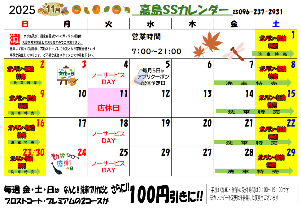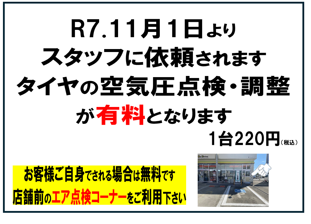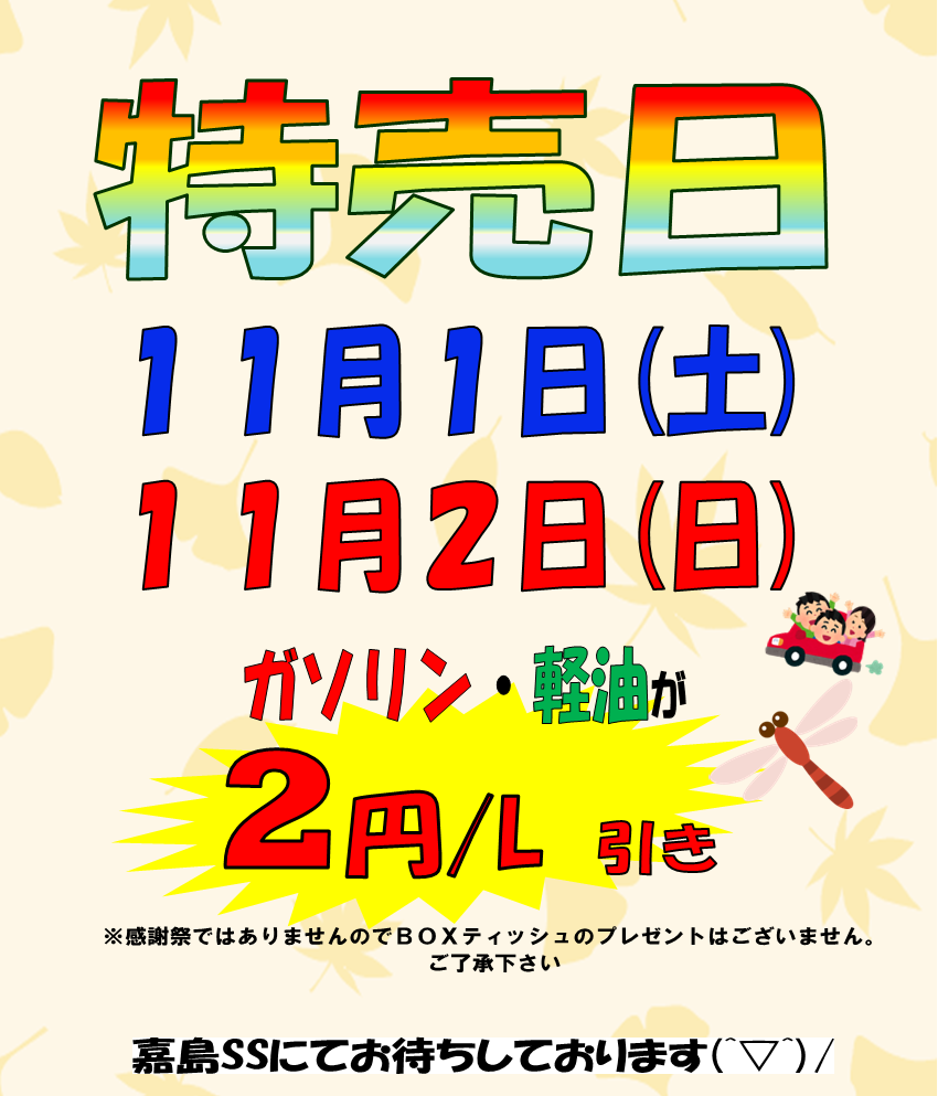 2025.10.31 ★週末特売★のお知らせ 嘉島SS Dr.Drive嘉島SSお知らせ いつも嘉島SSをご利用いただき 誠にありがとうございます 週末特売 セルフ洗車 10月31日(金)11月1日(土)11月2日(日)の3日間 セルフ洗車がお得(*^-^*)✨✨ プロストコートとプレミアムの2コースに限り プリカで100円引きに😍😍 空気圧点検 有料化 尚、エムロード各店にて 車検・タイヤ購入・お車の購入をして頂いたお客様はスタッフが無料にて点検いたします 11月の行事予定 YouTube 一覧へ戻る 前の記事へ 次の記事へ