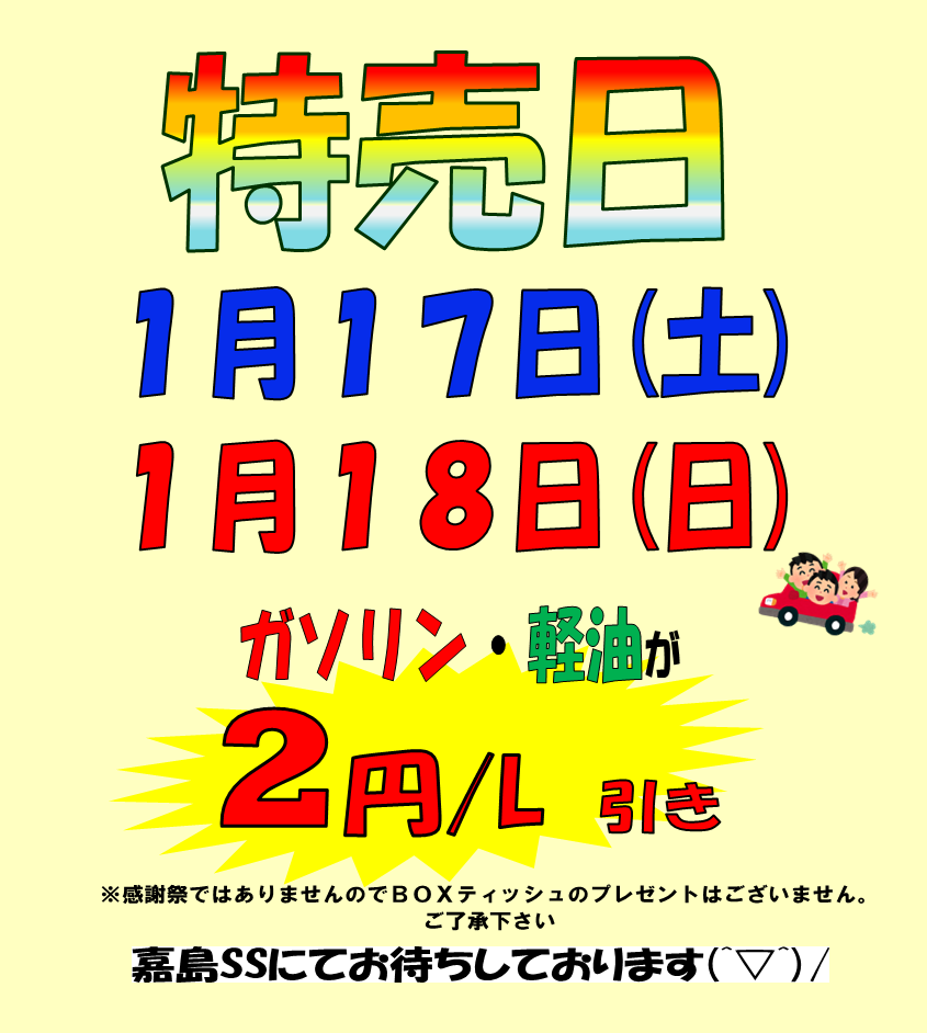 2026.01.16 ★週末特売★のお知らせ 嘉島SS Dr.Drive嘉島SSお知らせ いつも嘉島SSをご利用いただき 誠にありがとうございます 週末特売 セルフ洗車 1月16日(金)1月17日(土)1月18日(日)の3日間 セルフ洗車がお得(*^-^*)✨✨ プロストコートとプレミアムの2コースに限り プリカで100円引きに😍😍 春の車検フェア 空気圧点検 有料化のお知らせ 尚、エムロード各店にて 車検・タイヤ購入・お車の購入をして頂いたお客様はスタッフが無料にて点検いたします 一覧へ戻る 前の記事へ 次の記事へ