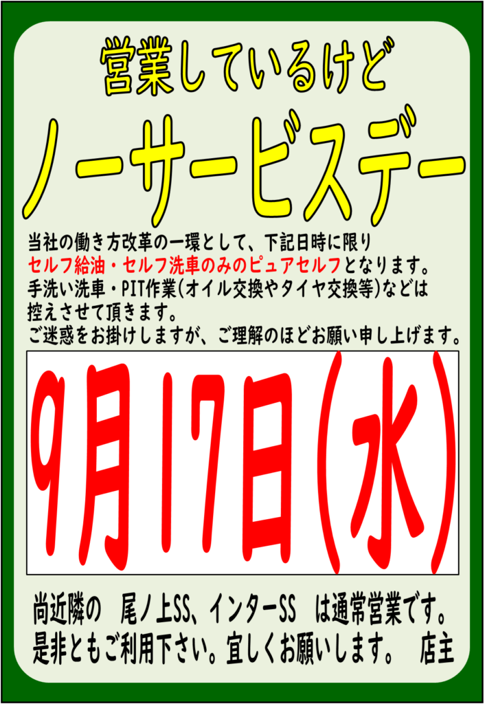 セルフ給油、セルフ洗車のみの営業とさせていただきます。