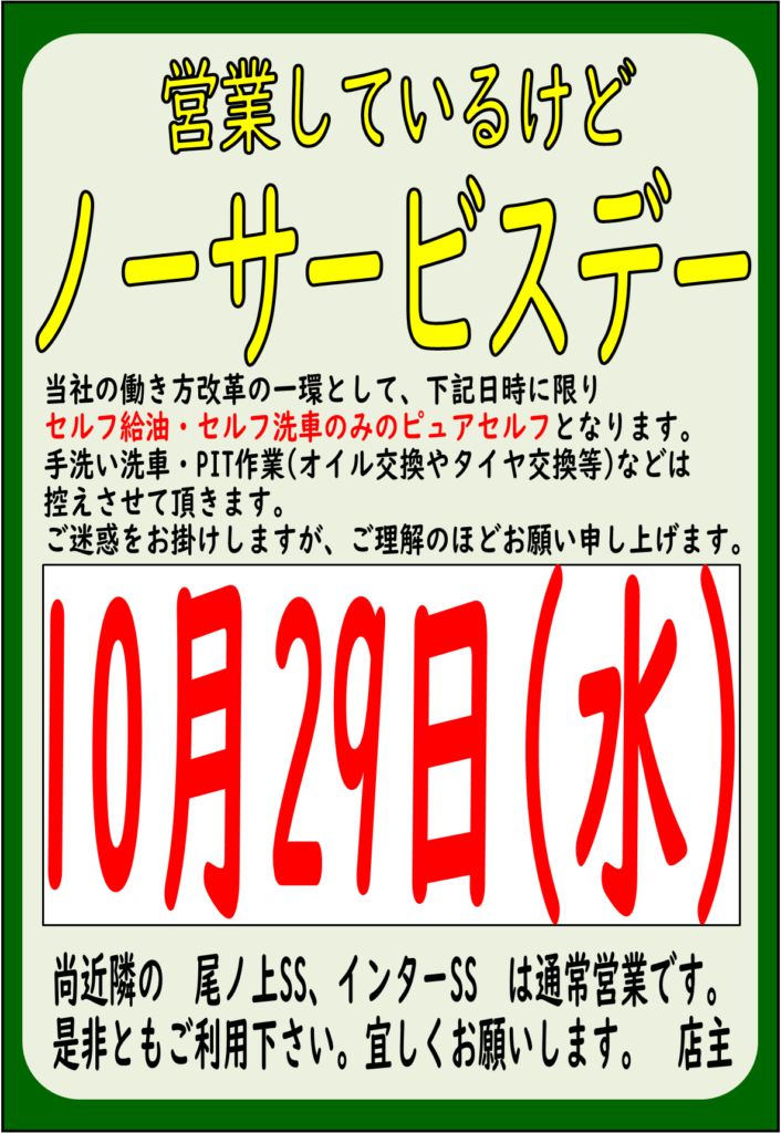 2025.10.28 【ノーサービスデーのお知らせ 小峯SS】 Dr.Drive小峯SSお知らせ 10月29日(水)は営業はしておりますがノーサービスデーとなっております。セルフ給油、セルフ洗車のみの営業とさせていただきます。オイル交換などのPIT作業及び手洗い洗車は行っておりませんのでご了承ください。ただし、緊急時(パンクやオーバーヒート等)には対応いたしますのでご相談ください。 お車のコーティング、してみませんか? 一覧へ戻る 前の記事へ 次の記事へ