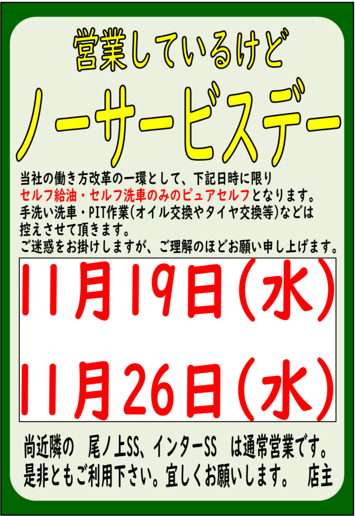 セルフ給油、セルフ洗車のみの営業とさせていただきます。