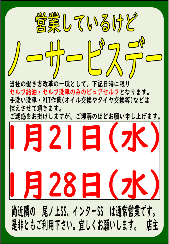 セルフ給油、セルフ洗車のみの営業とさせていただきます。
