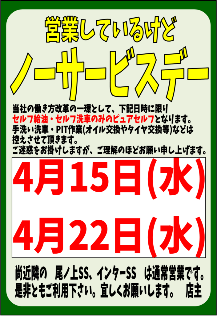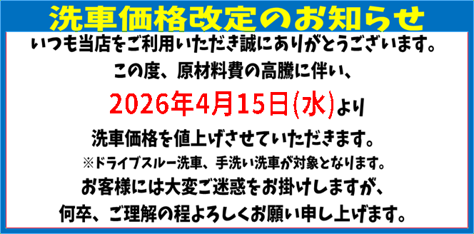 2026.04.14 【ノーサービスデーのお知らせ 小峯SS】 Dr.Drive小峯SSお知らせ 4月15日(水)は営業はしておりますがノーサービスデーとなっております。セルフ給油、セルフ洗車のみの営業とさせていただきます。オイル交換などのPIT作業及び手洗い洗車は行っておりませんのでご了承ください。ただし、緊急時(パンクやオーバーヒート等)には対応いたしますのでご相談ください。 【洗車価格改定のお知らせ】 一覧へ戻る 前の記事へ 次の記事へ