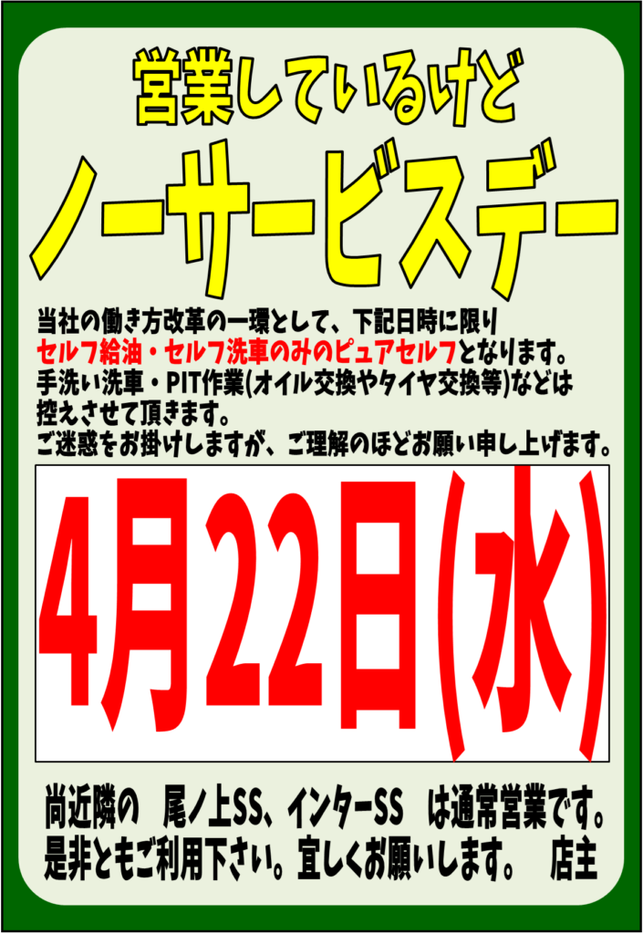 セルフ給油、セルフ洗車のみの営業とさせていただきます。