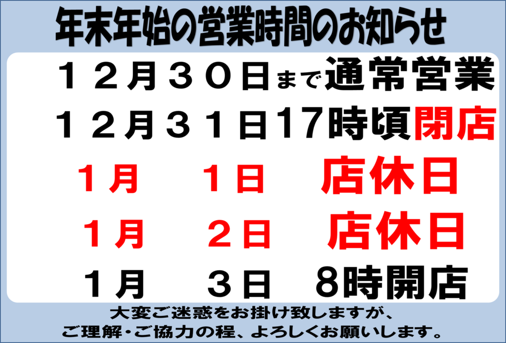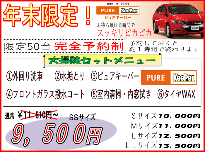 2025.12.22 【年末洗車予約】【年末年始営業時間】のお知らせエネオスセブンTATSUDA DDエネオスセブンTATSUDA 大絶賛!!今年もやります!! 年末の大掃除セットメニュー 年末の洗車予約を受付しております。 年越し前に愛車をお手軽に綺麗にしたい方にお勧めです。 セットメニューになりますのでお車の外回り+室内までピカピカに★ 1時間毎の完全予約制となりますので、詳しくは店頭スタッフまたはお電話にてお問い合わせ下さい。 一覧へ戻る 前の記事へ 次の記事へ