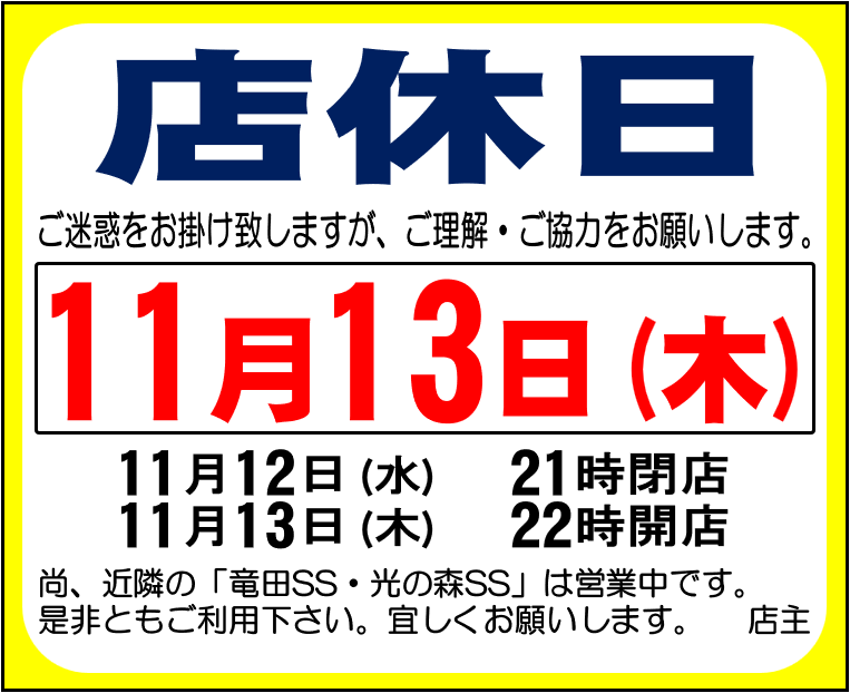 2025.11.12 【店休日】のお知らせ 菊南SS Dr.Drive菊南SSお知らせ いつもご利用いただきありがとうございます。 菊南SSです。 【店休日】のお知らせ 一覧へ戻る 前の記事へ 次の記事へ