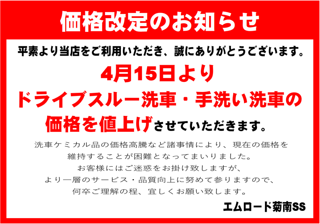 【洗車価格改定】のお知らせ 菊南SS