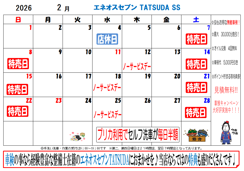 【2月の予定表】【春の車検フェア】【車の移動スタッフ募集】のお知らせ エネオスセブンTATSUDA