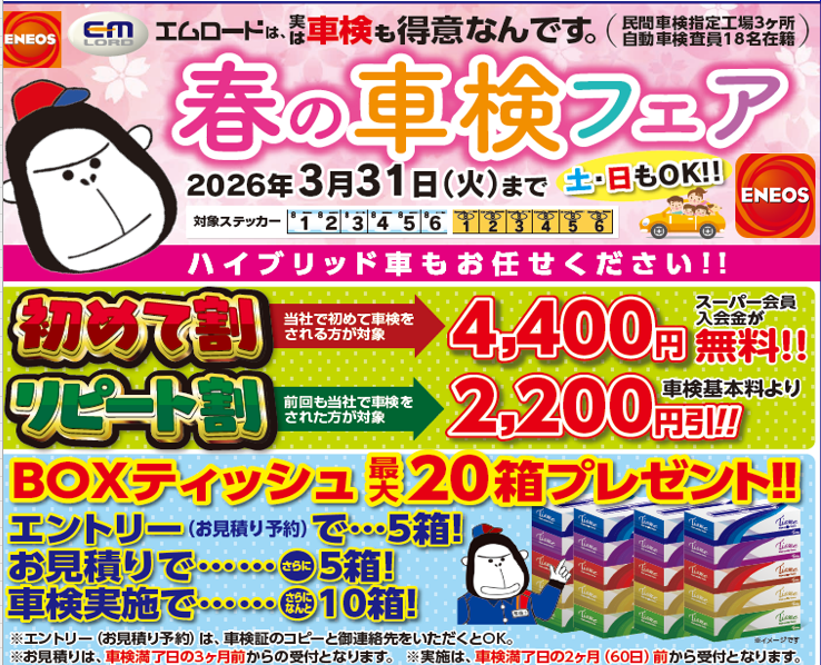 2026.01.23 【週末特売】【春の車検フェア】のお知らせ エネオスセブンTATSUDA DDエネオスセブンTATSUDAお知らせ 【週末特売】 1月24日(土)8:00から 1月25日(日)21:00まで ガソリン・軽油 通常価格より2円/L引き 一覧へ戻る 前の記事へ 次の記事へ