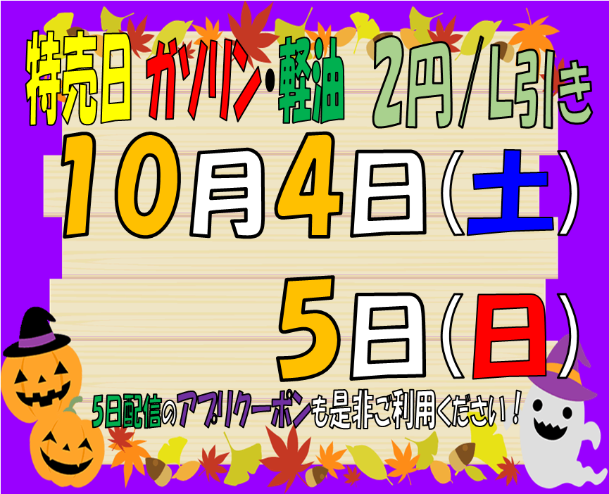 2025.10.03 【週末特売のお知らせ 小峯SS】 Dr.Drive小峯SSお知らせ 10月4日~5日週末限定!ガソリン・軽油 特売日!ガソリン・軽油が2円/L引き!この機会に是非満タン給油されてくださいね♪アプリの小峯SSフォロワー様は5日に配信されるクーポンもご利用ください♪ ※クーポンの配信は午前9時頃を予定しております!(アプリクーポンとプロモーションIDの併用は出来ません。) お車のコーティング、してみませんか? 一覧へ戻る 前の記事へ 次の記事へ