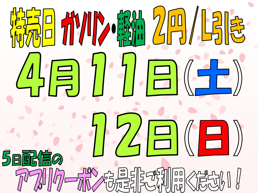 2026.04.10 【週末特売のお知らせ 小峯SS】 Dr.Drive小峯SSお知らせ 4月11日~12日週末限定!ガソリン・軽油 特売日!ガソリン・軽油が2円/L引き!この機会に是非満タン給油されてくださいね♪アプリの小峯SSフォロワー様は4月5日に配信済のクーポンもご利用ください!(アプリクーポンとプロモーションIDの併用は出来ません。) 一覧へ戻る 前の記事へ 次の記事へ