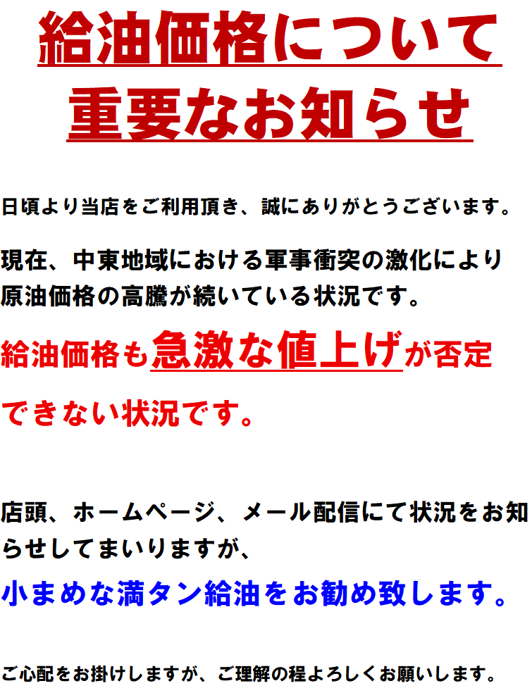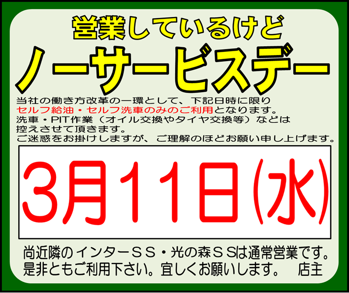 2026.03.10 【重要なお知らせ】と【ノーサービスデー】上南部SS Dr.Drive上南部SS ~・~・~・ お知らせ ・~・~・~ ~・~・~・ お知らせ② ・~・~・~ ご理解・ご協力の程よろしくお願い致します。 一覧へ戻る 前の記事へ 次の記事へ