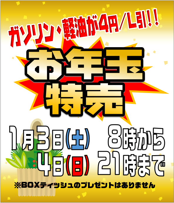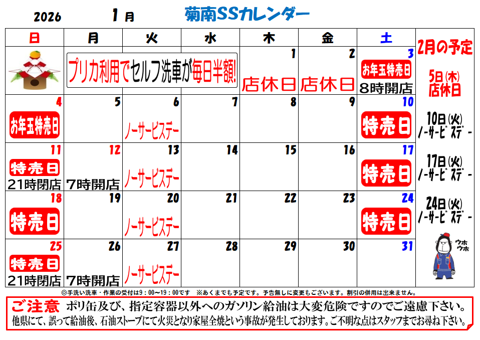 2026.01.02 【1月の予定】【お年玉特売】のお知らせ 菊南SS Dr.Drive菊南SSお知らせ 新年あけましておめでとうございます。 本年もどうぞ宜しくお願い致します。 2026年1月は3日(土) 8時より通常営業となります。 【1月の予定】 【お年玉特売】のお知らせ 一覧へ戻る 前の記事へ 次の記事へ