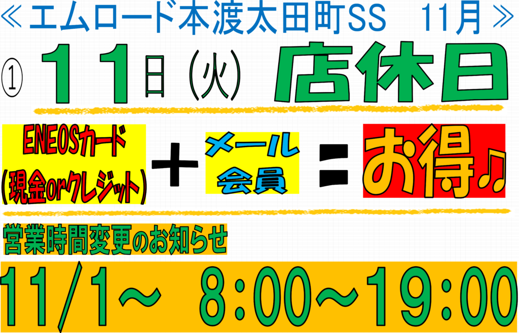 2025.10.20 エムロード本渡太田町SSから営業時間変更のお知らせ Dr.Drive本渡太田町SS重要なお知らせ お世話になっております。 エムロード本渡太田町SSです。 誠に勝手ながら11月1日より 営業時間を 8時~19時までとさせていただきます。 ご理解とご協力を宜しくお願いします。 一覧へ戻る 前の記事へ 次の記事へ