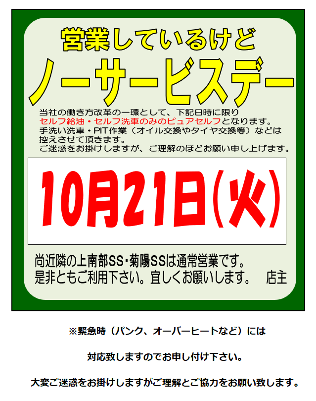 2025.10.20 ノーサービスデーのお知らせ 熊本インターSS Dr.Drive熊本インターSSお知らせ いつもご利用いただき誠にありがとうございます。 エムロード 熊本インターSSからのお知らせです。 ノーサービスデー 一覧へ戻る 前の記事へ 次の記事へ