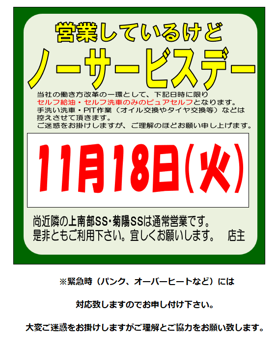 ノーサービスデーのお知らせ 熊本インターSS