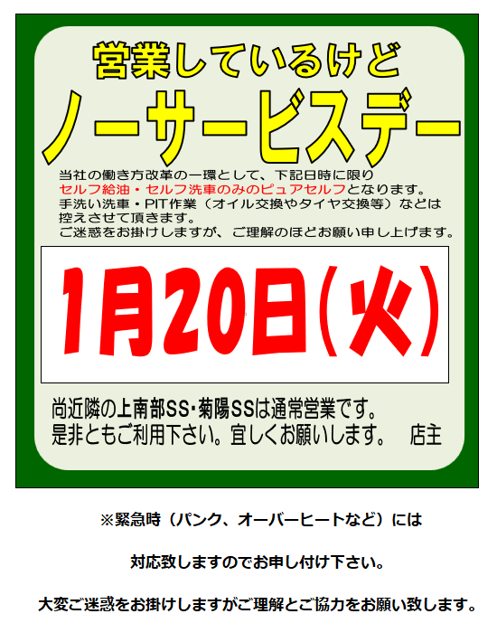 2026.01.19 ノーサービスデーのお知らせ 熊本インターSS Dr.Drive熊本インターSSお知らせ いつもご利用いただき誠にありがとうございます。 エムロード 熊本インターSSからのお知らせです。 ノーサービスデー お得な春の車検フェア♪ 一覧へ戻る 前の記事へ 次の記事へ