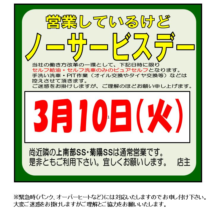 ノーサービスデーのお知らせ 熊本インターSS