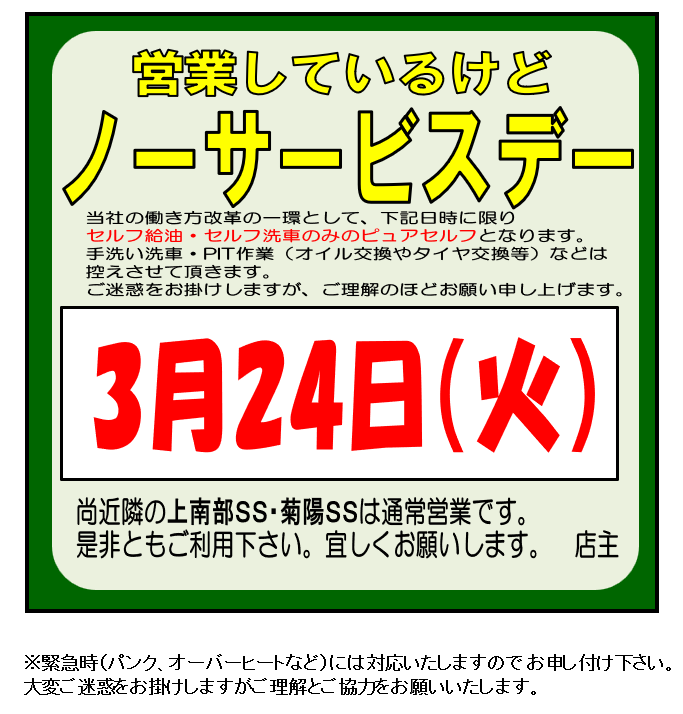 2026.03.23 ノーサービスデーのお知らせ 熊本インターSS Dr.Drive熊本インターSSお知らせ いつもご利用いただき誠にありがとうございます。 エムロード 熊本インターSSからのお知らせです。 ノーサービスデー 一覧へ戻る 前の記事へ 次の記事へ