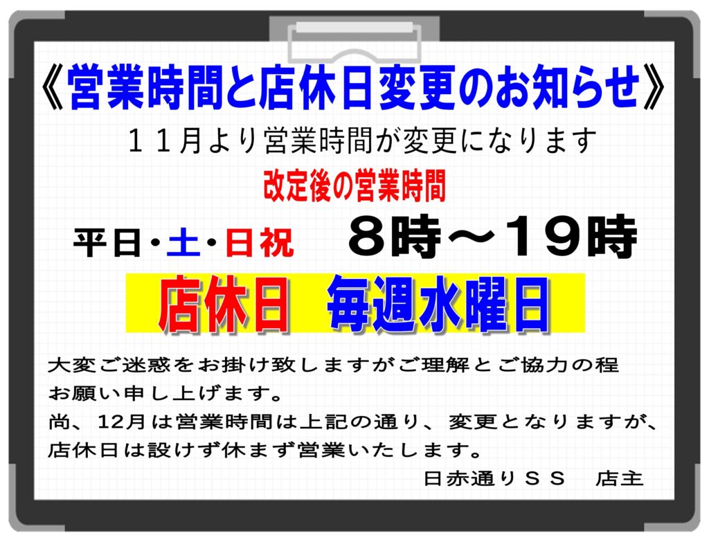 営業時間変更のお知らせ。 エムロード日赤通りSS