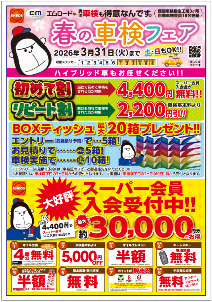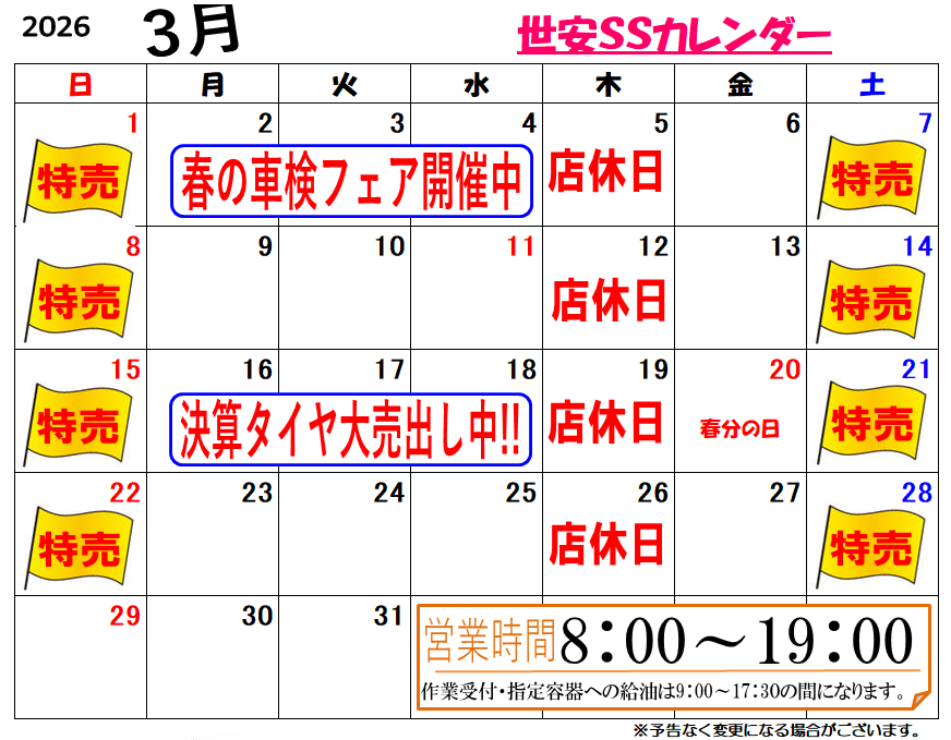 2026.03.04 店休日のお知らせ 世安SS Dr.Drive世安SSお知らせ 皆さんこんにちは1.2.3.世安SSです。 明日3月5日(木)は店休日となります。 ご迷惑をお掛けしますがよろしくお願いいたします(*- -)(*_ _)ペコリ 近隣の新町SSは通常営業となります。 3月のご案内になります 春の車検フェア大好評いただいています。 無料見積りお待ちしてます。 一覧へ戻る 前の記事へ 次の記事へ
