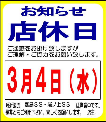 店休日のお知らせ 健軍SS