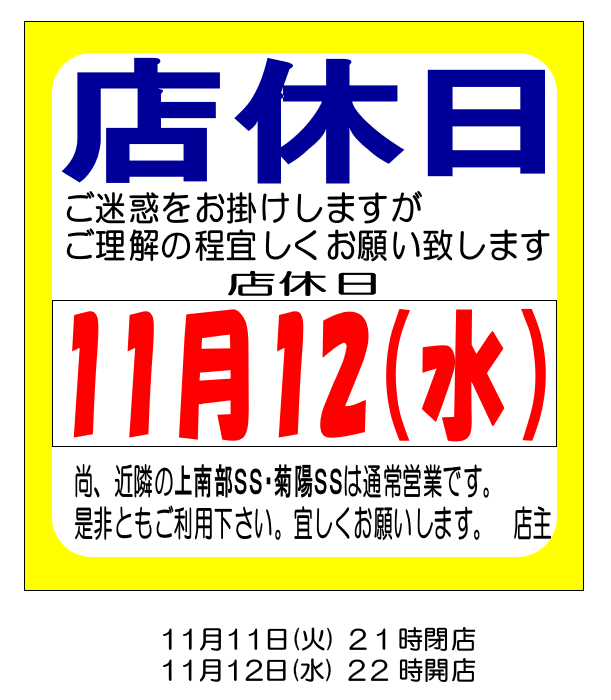 2025.11.11 店休日のお知らせ 熊本インターSS Dr.Drive熊本インターSSお知らせ いつもご利用いただき誠にありがとうございます。 エムロード 熊本インターSSからのお知らせです。 店休日 一覧へ戻る 前の記事へ 次の記事へ