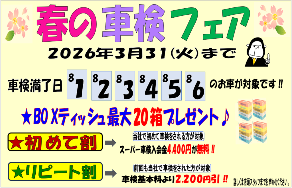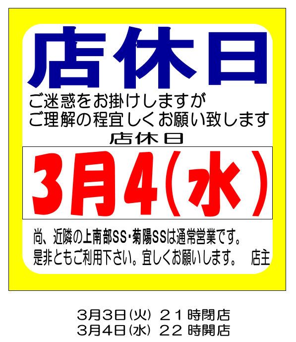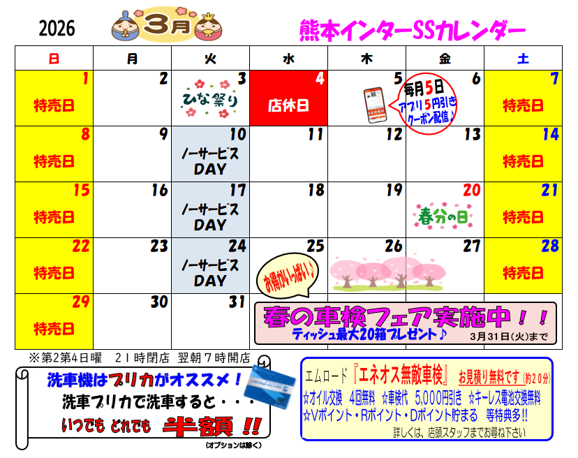 2026.03.03 店休日のお知らせ 熊本インターSS Dr.Drive熊本インターSSお知らせ いつもご利用いただきありがとうございます。 エムロード 熊本インターSSからのお知らせです。 店休日のお知らせ ★3月のカレンダー★ 春の車検フェア♪ エントリー受付 3月31日(火)まで‼ 一覧へ戻る 前の記事へ 次の記事へ