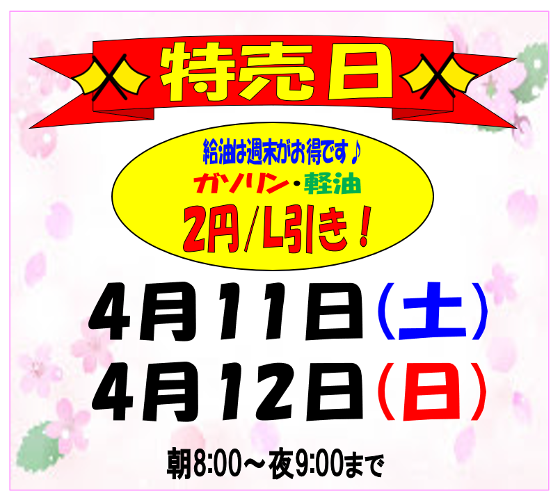 2026.04.10 特売日のお知らせ♪ 熊本インターSS Dr.Drive熊本インターSSお知らせ いつもご利用いただきありがとうございます。 エムロード 熊本インターSSからのお知らせです。 特売日♪ みなさまのご来店をスタッフ一同お待ちしております。 一覧へ戻る 前の記事へ 次の記事へ