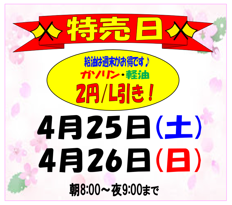 2026.04.24 特売日のお知らせ♪ 熊本インターSS Dr.Drive熊本インターSSお知らせ いつもご利用いただきありがとうございます。 エムロード 熊本インターSSからのお知らせです。 特売日♪ 皆様のご来店をスタッフ一同お待ちしております。 一覧へ戻る 前の記事へ 次の記事へ