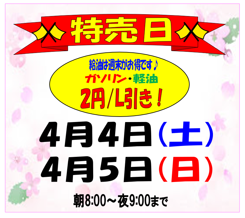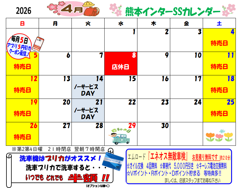 2026.04.03 特売日のお知らせ♪ 熊本インターSS Dr.Drive熊本インターSSお知らせ いつもご利用いただきありがとうございます。 エムロード 熊本インターSSからのお知らせです。 特売日♪ みなさまのご来店をスタッフ一同お待ちしております。 ★4月のカレンダー★ 一覧へ戻る 前の記事へ 次の記事へ