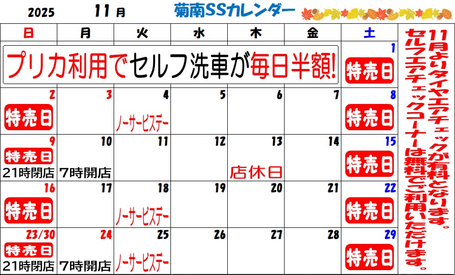 2025.10.31 菊南SS 11月予定表 Dr.Drive菊南SSお知らせ 12月コーティングのご予約受付中です! 当店のコーティング施工動画をYouTubeにアップしておりますので、 ぜひご覧ください! 特売日のお知らせ 一覧へ戻る 前の記事へ 次の記事へ
