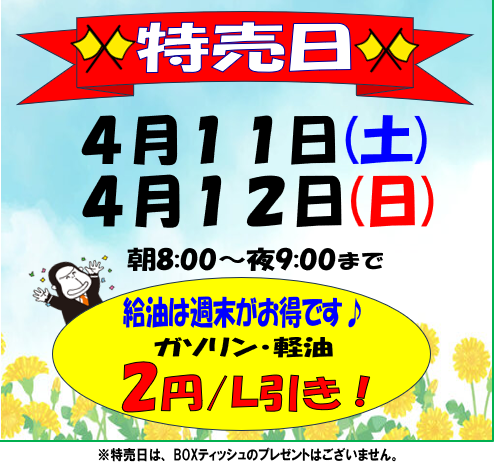 週末特売のお知らせ 尾ノ上SS