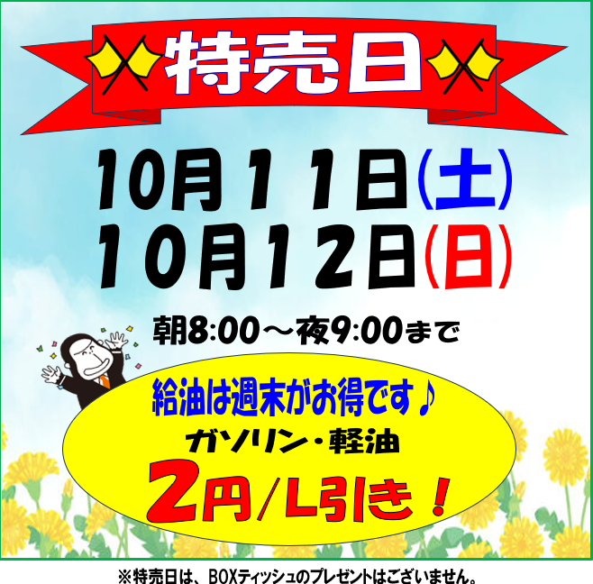 2025.10.10 週末特売のお知らせ 尾ノ上SS Dr.Drive尾ノ上SSお知らせ いつもご利用ありがとうございます。 エムロード尾ノ上SSからのお知らせです。 一覧へ戻る 前の記事へ 次の記事へ