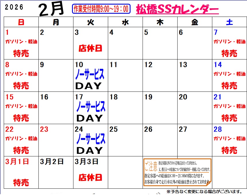 2月予定カレンダー 松橋SS