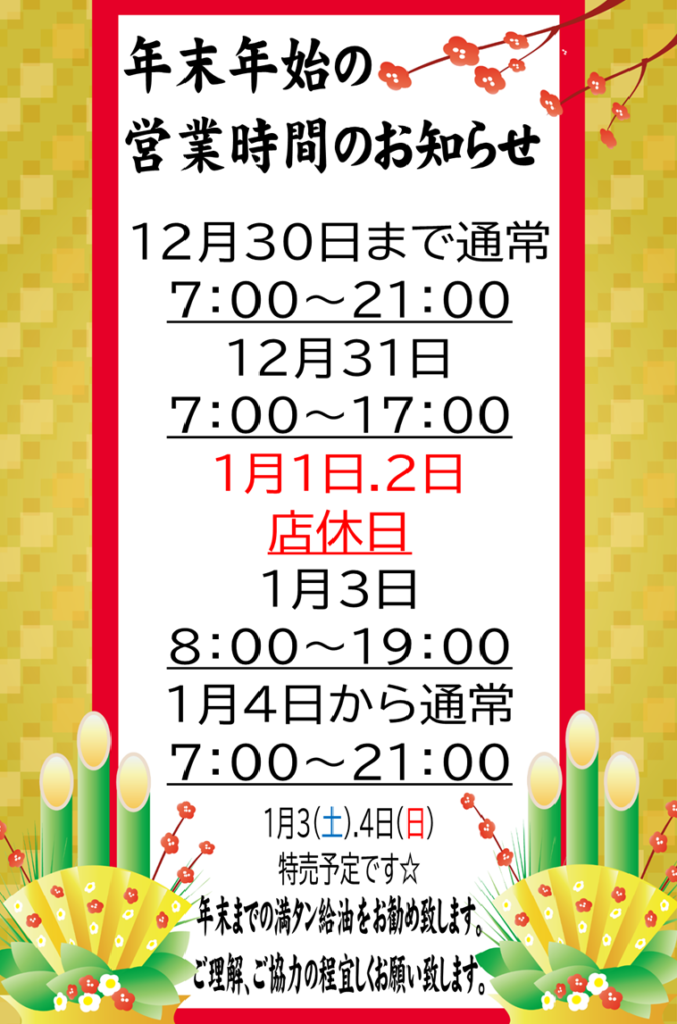 2025.12.29 ~年末年始のご案内~ 上南部SS Dr.Drive上南部SS いつも当店をご利用頂き、誠にありがとうございます。 今年も残すところあと3日。寒さも厳しくなり お忙しい日々をお過ごしの事と思います。 体調には十分お気を付け下さい。 年明けの1日・2日はエムロード全店、店休日となりますので 年末までの満タン給油をお勧め致します。 来年もどうぞ、宜しくお願い致します。 一覧へ戻る 前の記事へ 次の記事へ